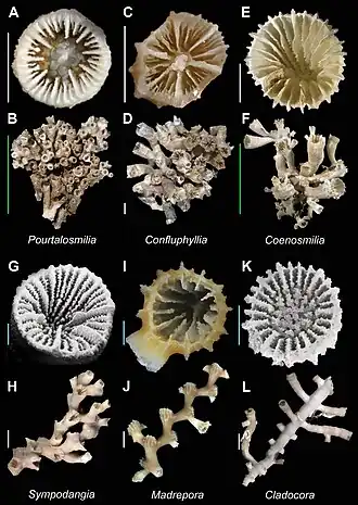 También es aplicable al género Millepora, denominado comúnmente "coral de fuego", y al género Heliopora, denominado "coral azul". Todos ellos conforman los corales hermatípicos, principales contribuyentes en la formación de arrecifes.