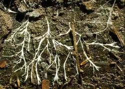 - ↑ a b Townsend BB (1954). «Morphology and development of fungal Rhizomorphs». Transactions of the British Mycological Society 37 (3): 222-233. doi:10.1016/s0007-1536(54)80004-0.