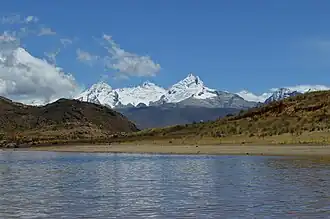 La cordillera Blanca es una cadena montañosa ubicada en la sierra del departamento de Áncash, Perú. Forma parte de la cordillera de los Andes y se extiende en dirección noroeste por unos 200 km.[3] Ocupa un área de 16 000 km², siendo la cadena montañosa tropical nevada más extensa con 17 picos que sobrepasan los 6000 m s. n. m., 1072 lagunas y 722 glaciares.[3] El Huascarán (6757 m s. n. m.) la montaña más alta del país y de la zona intertropical se encuentra en esta cordillera.[1]