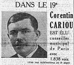 En 1938, fue elegido representante del barrio del Puente-de-Flandes (distrito 19° de París), Corentin Cariou entra al consejo municipal de París.