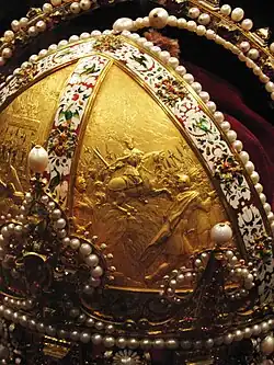La mitra simboliza el ejercicio, por parte del emperador, del poder absoluto por derecho divino y su relevante posición espiritual, en su coronación era consagrado simbólicamente como diácono de la Iglesia católica. La mitra se encuentra dividida en dos permitiendo, como sucede en la Corona del Sacro Imperio, que en la parte central de la misma puedan colocarse dos diademas. Como las otras partes de la corona es de oro, está adornada con franjas esmaltadas en las que figuran aves y elementos vegetales. En la superficie de la mitra aparecen representadas cuatro escenas diferentes, las tres primeras aluden a los títulos más importantes de Rodolfo II, y la cuarta es una alegoría de un supuesto triunfo sobre los turcos. En la primera el monarca aparece arrodillado, en el momento de ser coronado Sacro Emperador Romano en Ratisbona. En la segunda, se encuentra cabalgado en la colina de la coronación en Bratislava durante la ceremonia de su entronización como rey de Hungría. En la tercera, Rodolfo II aparece representado durante la procesión por la ciudad de Praga, después de su coronación como rey de Bohemia. En la cuarta escena figura una representación alegórica de su victoria sobre los turcos, hecho que no posee suficiente base histórica.