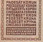 Österreichisch-ungarische Krone (alemán) osztrák-magyar korona (húngaro) corona Austro-Hungarica (latín) Rakousko-uherská koruna (checo) korona austro-węgierska (polaco) корона (ucraniano) corona austro-ungarica (italiano) krona (esloveno) austro-ugarska krune (croata) аустро-угарска круна / austro-ugarska kruna (serbio) coroană austro-ungară (rumano) | ||||