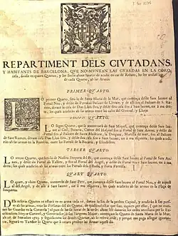 Desde la estructuración de 1544 los cofrades de los gremios barceloneses estuvieron en estado de movilización latente, desactivados pero armados y organizados para ser convocados con rapidez bajo las órdenes del conseller en Cap de Barcelona. En 1635, al desencadenarse la Guerra franco-española (1635-1659) en el marco de la Guerra de los Treinta Años (1618-1648), se ordenó la movilización de la milicia barcelonesa. El agravamiento de la situación militar y la política del conde duque de Olivares provocaron el estallido de la Sublevación de Cataluña (1640) y la independencia de Cataluña constituyéndose en una efímera República de Cataluña que sería fagocitada poco después por Francia. En octubre de ese mismo año 1640 la milicia de Barcelona fue reorganizada en 4 tercios con sus respectivos maestros de campo y sargentos mayores.[5] Paralelamente Barcelona armó a compañías de militares profesionales, que acabaron fundiéndose con la milicia gremial en el Tercio de la Bandera de Santa Eulalia, mientras se levó otro tercio de profesionales a sueldo, el Tercio de Barcelona, cuya actuación fue decisiva para conseguir la victoria en la Batalla de Montjuic (1641), primera vez en la historia en la que los tercios españoles eran derrotados en el campo de batalla antecediendo en dos años a la Batalla de Rocroi (1643).[6] Pero finalmente, tras la caída en desgracia del conde duque de Olivares y años de conflicto, Juan José de Austria puso fin al sitio de Barcelona (1652) y a la guerra de Cataluña pactando una condiciones muy ventajosas con las autoridades catalanas y el mantenimiento del ordenamiento constitucional catalán. Por su parte el monarca obtuvo el control de las insaculaciones de los Comunes de Cataluña —Generalidad de Cataluña y Consejo de Ciento de Barcelona—, así como el control sobre los portales, las murallas, y la armería de la ciudad de Barcelona.[7]