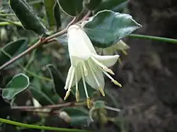 Alcanza una altura por encima de los 2 metros. Sus hojas ovadas son de 3 cm de longitud y 2 cm de anchura, de un color verde oscuro brillante en el haz y gris pálido en el envés.[1] La flores colgantes tienen una forma tubular y un color de verde amarillento a blanco.[1]