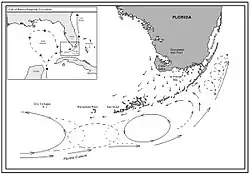 La corriente de Florida resulta del movimiento de empuje del Atlántico hacia el mar Caribe por la rotación de la Tierra (que ejerce una fuerza más grande en el ecuador). El agua se apila subiendo el nivel y la presión de la columna de agua próxima al continente. Fluye a lo largo de América Central hacia el norte a través del canal de Yucatán hacia el golfo de México. El agua es calentada en el golfo y forzada a salir a través del estrecho de Florida, entre los Cayos de la Florida y Cuba y fluye hacia el norte a lo largo de la costa del este de los Estados Unidos. La corriente de Florida es a menudo denominada de forma imprecisa como corriente del Golfo. De hecho, la corriente de Florida se suma a la corriente del Golfo lejos de la costa oriental de Florida.