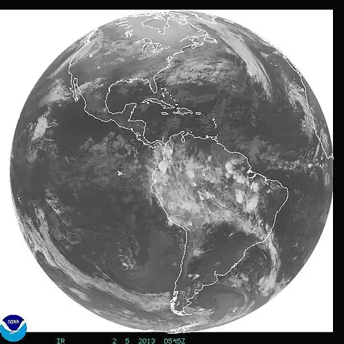Imagen de radar del hemisferio occidental correspondiente al continente americano, tomada el 5 de febrero de 2013. Pueden verse los sistemas nubosos (en blanco), en el que destaca el sistema alargado del sur del Pacífico que corresponde a los vientos del oeste cuyas nubes se interrumpen al llegar a la costa sur de Chile. Pero también puede verse en este caso que la dirección de los vientos no coincide exactamente con la de las corrientes marinas aunque el mapa de corrientes de 1943 así lo muestre.