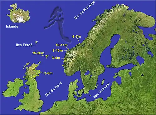 - El Corrimiento de Storegga, cerca de la costa noruega de 3500 km³, hace aproximadamente 8000 años, que generó un impacto catastrófico en la población mesolítica, terminando de inundar Doggerland, separando Normandía de las islas británicas.[11]