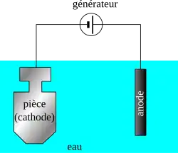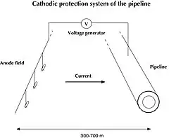 - La protección catódica mediante una corriente eléctrica es otro ejemplo de protección contra la corrosión.[2] Una fuente de alimentación eléctrica de corriente continua se puede conectar para oponerse a la corriente galvánica corrosiva. Se emplea en estructuras grandes donde los ánodos galvánicos no pueden suministrar suficiente protección. (Véase sistema de protección catódica por corriente impresa)