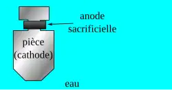 - La protección catódica mediante ánodos de sacrificio: Se conecta el metal que queremos proteger con una barra de otro metal más activo, que se oxidará preferentemente, protegiendo al primer metal.[2] Se utilizan uno o más ánodos de sacrificio de un metal que sea más fácilmente oxidable que el metal protegido. Los metales que comúnmente se utilizan para ánodos de sacrificio son el zinc, el magnesio y el aluminio.