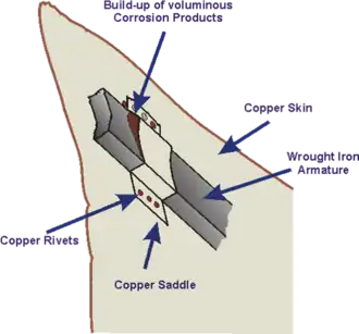 Un ejemplo anterior ocurrió en la fragata de la Royal Navy HMS Alarm. El casco de madera de la embarcación había sido revestido de cobre para evitar el ataque de los percebes. Pronto se descubrió que la cubierta se había desprendido del casco en muchos lugares, porque los clavos de hierro que habían sido utilizado para fijar el cobre a la madera se habían corroído completamente. Una inspección más detallada reveló que algunos clavos, que estaban menos corroídos, estaban aislados del cobre por un papel marrón que estaba atrapado bajo la cabeza del clavo. El cobre había sido entregado al astillero envuelto en el papel que no se quitó antes de que dichas planchas fueran clavadas al casco. La conclusión obvia, pues, y la que figura en un informe al Almirantazgo de 1763, fue que no se debe permitir el contacto directo del hierro con el cobre en un entorno de agua de mar si se quiere evitar una severa corrosión del hierro. Más tarde, los buques se han diseñado teniendo esto en cuenta. No sólo el agua de mar era un electrolito muy bueno, debido a su alta concentración de sal, sino que el ataque de los clavos fue favorecido por su área de exposición tan pequeña en comparación con el de la cubierta de cobre del casco.