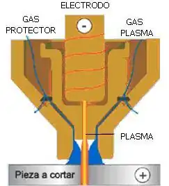 Una vez el arco-plasma está establecido, la pieza se carga positivamente mientras el electrodo se carga negativamente, lo que hace mantener el arco-plasma y cortar la pieza.
