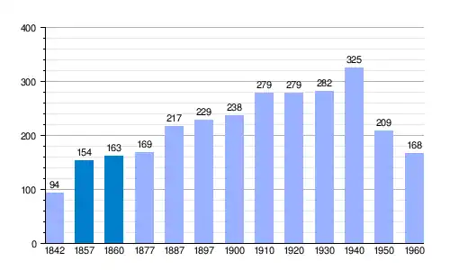 | Gráfica de evolución demográfica de Cortes de Tajuña[4] entre 1842 y 1960 |