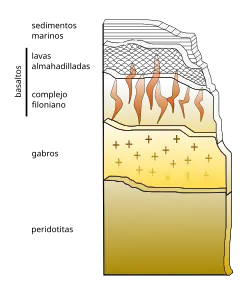 - Capa 2: constituida por rocas máficas y mafico-volcánicas, tiene un espesor de 1-2 km y la velocidad de las ondas sísmicas es de 4,5-6,5 km/s. Esta capa está formada por diques seriados y lava acojinada, los primeros son importantes porque permiten conocer la posición de la dorsal en ciertos casos, tienen una textura ofítica (compuesta por piroxenos y plagioclasa). La lava acojinada es bastante compacta aunque puede tener nódulos de chert, carbonatos y diabasas.