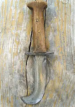 Hoja: presenta forma curva, la que le da su denominación, fabricada en acero procedente de hoces, discos de arado, limas, etc. El acero es oxidable siempre con un contenido de carbono relativamente alto, ya que puede afilarse mucho más que la aleación inoxidable, por lo que debería protegerse contra la herrumbre con aceite mineral. La hoja de unos 3-5 mm de grosor termina en punta, la que puede estar entre 10°-90° medidos tomando como referencia el eje longitudinal del arma. La hoja es introtorsa; es decir, el filo principal es el interno, pudiendo no estar presente uno externo. Este último puede ocupar una proporción variable del dorso. La hoja es enteriza, es decir, continúa como una espiga al interior de la empuñadura.[nota 1]