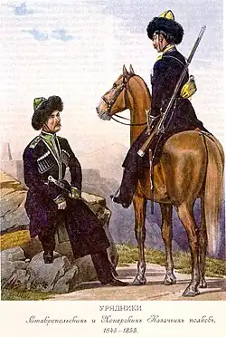 Los cosacos de Mozdok, del Volga y del Jopior visten la misma ropa que los cosacos del Don y están armados con pistolas, sables y dardos.