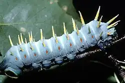 Las orugas jóvenes son de color blanquecino, presentan rayas transversales negras y están cubiertas de espinas muy ramificadas en todos los segmentos corporales. Las orugas adultas tienen una base azul claro, tráqueas rojizas y delgadas protuberancias amarillas (escolos) en cada segmento corporal.
