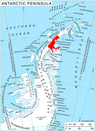 La barrera de hielo Larsen se extiende desde la costa Oscar II sobre el mar de Weddell. El interior de la costa presenta cordones montañosos transversales separados por glaciares que desembocan en la barrera de hielo Larsen.