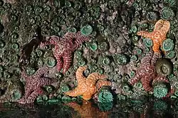 Las pozas de marea, que aparecen con frecuencia a lo largo de las costas rocosas de Oregón, son ecosistemas únicos y contenidos que albergan hasta cientos de especies de animales. Es común ver algas rojas, verdes y marrones. En estas pozas de marea costeras también se pueden encontrar muchas especies de invertebrados, entre los que se incluyen esponjas, anémonas de mar, mejillones, estrellas de mar, lapas, cangrejos, camarones, percebes, erizos de mar y pepinos de mar. El Parque Estatal Sunset Bay, cerca de Coos Bay, y Strawberry Hill, cerca de Yachats, se encuentran entre las mayores colecciones de pozas de marea y son lugares populares para explorarlas.