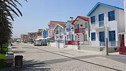 Otro destino turístico de la Costa de Plata es Costa Nova, cerca de Aveiro, donde son populares las casas de madera de colores situadas en una flecha de arena entre la ría y el mar abierto.