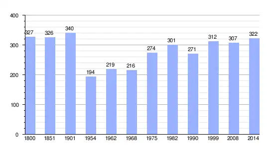 Los datos demográficos contemplados en este gráfico de la comuna de Coulanges[4] se han cogido de 1800 a 1999 de la página francesa EHESS/Cassini, y los demás datos de la página del INSEE.[5]