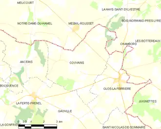 - ↑ INSEE, Datos de población para el año 2012 de Couvains (en francés).