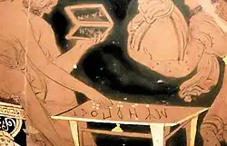 Se muestra a un recaudador de impuestos, el tesorero real, recibiendo pagos de varias naciones conquistadas, cuyos representantes se postran ante él.[5] Sobre una mesa hay una tabla de cálculo —un tablero de cálculo o abax, utilizado para cálculos complicados—, con una serie de piedrecitas o fichas delante de los números griegos para calcular números grandes.[6][2] En la tabla de cálculo aparece el símbolo «O», un símbolo beocio para el óbolo, o unidad pequeña. El uso de guijarros sobre un tablero para hacer cálculos se ilustra hasta los tiempos modernos por el hecho de que la calpe es “piedra” en latín, que es la etimología de la palabra ‘cálculo’.