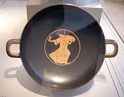 En el medio de cada sección había bucles de cuero en los que los bailarines cruzaban el pulgar y el dedo medio para sostenerlos y golpearlos rítmicamente y mantener el ritmo durante el baile, mientras también acompañaban con aulós y liras, tanto en celebraciones públicas, como en orgías artísticas, o en honor a Dioniso y Cibeles, como también en fiestas privadas. La iconografía arqueológica muestra mujeres bailando, comediantes masculinos que asistían a las festividades, y sátiros, seguidores de Dioniso.[2]