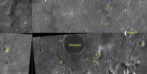 Por convención estos elementos son identificados en los mapas lunares poniendo la letra en el lado del punto medio del cráter que está más cerca de Crüger.