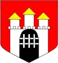 Ver Edificio. La torre es representada ordinariamente redonda, a veces cuadrada, con una puerta y una ventana. La torre está normalmente "almenada de tres piezas", es decir que su aparato de almenas no muestra más que tres merlones. De plata a la torre de gules.