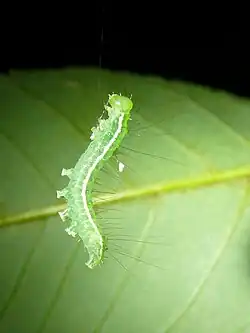 Las orugas se alimentan de Fraxinus excelsior, Syringa vulgaris y Ligustrum vulgare.