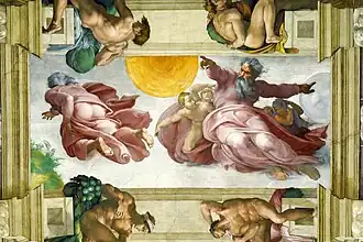 Dios aparece nuevamente con su túnica rosa y esta vez, ésta se expande en forma de concha para proteger y transportar a los ángeles que lo acompañan, imagen que se repetirá en la Creación de Adán.