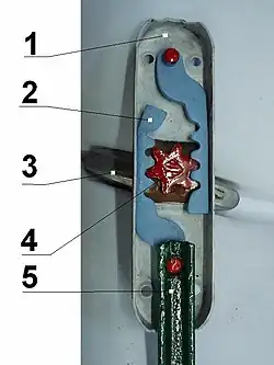 Visto desde la parte trasera, las partes del engranaje de la cremona (1) incluyen la palanca o perilla (3), que hace girar el piñón (4), engranando el par de cremalleras (2), que luego empujan los dos barras de sección semicircular (5) hacia arriba y hacia abajo al mismo tiempo (solo se muestra la barra inferior), en los casquillos.