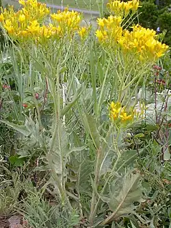 Es una planta herbácea perenne con tallo ramificado que aclanza hasta 70 centímetros de altura a partir de una raíz pivotante. Las hojas son verdes-grises, largas y cortadas con, señaló lóbulos triangulares. La más larga, cerca de la base de la planta, puede alcanzar los 40 centímetros de longitud. La inflorescencia es un conjunto abierto de flores en la parte superior de las ramas del tallo. Cada una de las muchos capítulos de flores está envuelto en lbrácteas vellosas. La cabeza de la flor se abre en una cara de hasta 10 flores liguladas amarillas. No hay flores en el disco. El fruto es un estrecho aquenio de 8 milímetros de largo con punta de 7 con un mechón de pelos blancos.