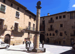 Lo más característico de la plaza es su magnífica columna central, originaria de 1584 y construida probablemente para un futuro edificio consistorial del que Cretas carecía en aquel momento por pertenecer administrativamente a Alcañiz. Dicha columna no estuvo siempre en la plaza, hasta bien entrado el siglo veinte estaba más allá de las murallas de la población, cerca de la capilla de San Roque. Sobre ella, el antiguo escudo de la población, con los signos que nos hablan de su larga historia. La cruz de la orden de Calatrava, fundadores cristianos de Cretas y señores de la misma hasta el siglo XV. El cordero pascual, símbolo eclesiástico posiblemente asociado al periodo de señorío del obispado de Tortosa, así como de las barras aragonesas que nos recuerdan su título de Vila real. En cuanto al escudo moderno tiene la misma simbología, pero la colocación es distinta, y pasa de ser circular a cuadrado. El resto de la plaza está formado por edificios nobles, de sillería, algunas existentes ya en el siglo XV y otras, como el actual ayuntamiento bastante más recientes en su construcción. Antiguos o modernos, todos forman el núcleo central de Cretas y son testimonio de su largo pasado histórico.