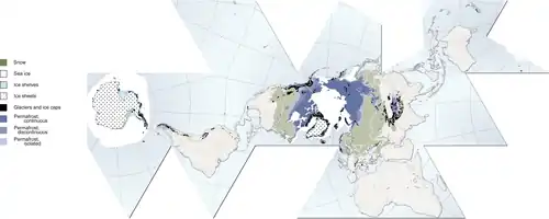 El suelo congelado (permafrost y suelo congelado estacionalmente) ocupa aproximadamente 54 millones de km2 de las áreas terrestres expuestas del hemisferio norte (Zhang et al., 2003) y, por lo tanto, tiene la mayor extensión de área de cualquier componente de la criosfera. El permafrost (suelo congelado perennemente) puede ocurrir donde la temperatura media anual del aire (MAAT) es inferior a −1 o −2 °C y generalmente es continuo donde MAAT es inferior a −7 °C. Además, su extensión y espesor se ven afectados por el contenido de humedad del suelo, la cubierta de vegetación, la profundidad de la nieve en invierno y el aspecto. La extensión global del permafrost aún no se conoce por completo, pero subyace aproximadamente en el 20 % de las áreas terrestres del hemisferio norte. Los espesores superan los 600 m a lo largo de la costa ártica del noreste de Siberia y Alaska, pero, hacia los márgenes, el permafrost se vuelve más delgado y discontinuo horizontalmente. Las zonas marginales estarán más inmediatamente sujetas a cualquier derretimiento causado por una tendencia al calentamiento. La mayor parte del permafrost existente actualmente se formó durante condiciones anteriores más frías y es, por tanto, relicto. Sin embargo, el permafrost puede formarse en los climas polares actuales cuando los glaciares retroceden o la emergencia de la tierra deja al descubierto el suelo no congelado. Washburn (1973) llegó a la conclusión de que la mayor parte del permafrost continuo está en equilibrio con el clima actual en su superficie superior, pero los cambios en la base dependen del clima actual y del flujo de calor geotérmico; por el contrario, la mayor parte del permafrost discontinuo es probablemente inestable o «se encuentra en un equilibrio tan delicado que el más mínimo cambio climático o de superficie tendrá efectos drásticos de desequilibrio».[25]