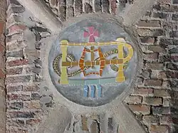 La clave de la bóveda contiene un crismón de la Santísima Trinidad, con la letra P (de Pater) en color amarillo, símbolo de la luz; la F (de Filius) en rojo, símbolo de martirio; y la S (de Spiritus) en naranja, síntesis de los otros dos. A lo largo de la cripta destaca asimismo la decoración con peces, símbolo de Jesús, ya que pez en griego es "ikhthus", acrónimo a su vez de Iesus Khristos Theos Uios Soter (Jesús Cristo Dios Hijo Salvador).[17]