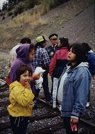 ![]() Miembros de la banda de Seton Lake bloquean la línea BC Rail en apoyo de Oka, mientras un oficial de la Real Policía Montada de Canadá observa. | ||||