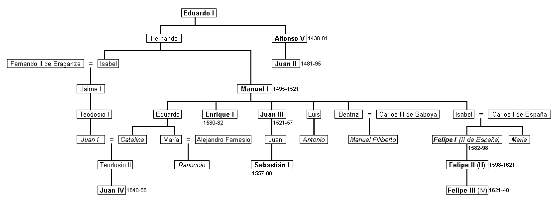 - Felipe II de España y sus descendientes (hijo de Isabel de Portugal, la hija mayor de Manuel I),
