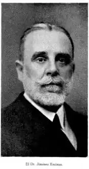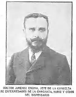 JIMENEZ ENCINA (CRISTÓBAL). Médico español, n. Monda (provincia de Málaga) en 1866 y m. en Madrid el 8 de marzo de 1956. Estudió en las Universidades de Valladolid y Madrid, y luego de haberse graduado, ingresó en el Instituto Rubio, de Madrid, como ayudante del doctor Uruñuela, especialista en otorrinolaringología, especialidad que, a su vez, adoptó también y a la que consagró toda su vida profesional. Del mismo Instituto y de dicha especialidad, fue después profesor. Por espacio de varios años prestó servicios gratuitos, como jefe de la clínica de enfermedades de la garganta, nariz y oído, en el Dispensario Antituberculoso de María Cristina, del que fue fundador. En 1931, al instaurarse en España la República, se vio privado de sus funciones oficiales por suponérsele monárquico. En 1939, al término de la Cruzada de Liberación, fue repuesto en los cargos que anteriormente había ostentado, tributándosele los honores a que su jerarquía científica y sus desvelos por la sanidad pública le habían hecho acreedor. El doctor Jiménez Encina era considerado como una de las más competentes .autoridades en otorrinolaringología; publicó numerosos trabajos sobre esta materia, tales como Abscesos faríngeos, Estenosis laríngeas de naturaleza sifilítica, La sordera en los escolares, Mentalidad de los niños adenoideos, Radium-radioterapia del cáncer laríngeo, Casos de extirpación total de la faringe, Pronósticos de la tuberculosis laríngea y muchos más, así como trató análogos temas en conferencias y en los diferentes congresos nacionales e internacionales en que participó. Era presidente de honor de la Sociedad Española de Otorrinolaringología. Estaba condecorado con la gran cruz de Beneficencia, Orden Civil de Sanidad y medalla de oro del Trabajo.[83]