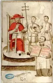 ![]() Cristóbal de Medrano ofreciéndole el manuscrito con la Missa Voce Mea al arzobispo Rodrigo de Castro | ||