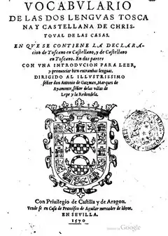 - Vocabulario de las lenguas española y toscana (1570), dedicada al marqués de Ayamonte: Antonio de Guzmán.