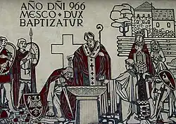 El «bautismo de Polonia» se refiere a la ceremonia en la que el primer gobernante del Estado polaco, Miecislao I, y gran parte de su corte se convirtieron a la religión cristiana.[5][8] La esposa de Miecislao, Dobrawa de Bohemia, una ferviente cristiana, desempeñó un papel importante en la promoción del cristianismo en Polonia, y podría haber tenido una influencia significativa en la conversión del propio Miecislao.[1][7]