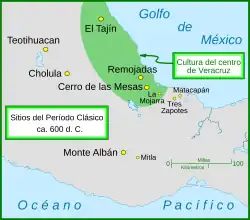 | Clásico tardío | 600–900 d. C. | Área maya: Uxmal, Comalcalco, Moral Reforma, Tortuguero, Toniná, Cobá, Xunantunich, Waka', Pusilhá, Xultún, Dos Pilas, Cancuén, Aguateca, La Blanca; Centro de México: Xochicalco, Cacaxtla, Cholula; Costa del golfo: El Tajín. |