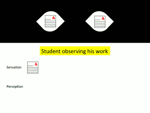 - Los ojos reciben información del entorno con respecto a un enfoque en particular. Esta entrada sensorial está enviada directamente a la corteza visual para ser procesada. Después del procesamiento visual, conscientemente percibimos este objeto de enfoque.[8] En el contexto de un estudiante en un aula, los ojos de un estudiante se centran en una hoja de papel en su pupitre. Sus ojos recolectan la luz reflejada de la hoja de papel y dicha información es procesada en la corteza visual, el estudiante conscientemente percibe la hoja frente a él.
