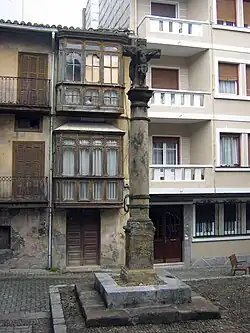 Se trata de un calvario que fue tallado en el año 1611 por orden de Rodrigo Abad de Mendecano.[2] Así, es una muestra del Renacimiento tardío,[3] que cuenta con 4,42 metros de altitud.[3] En la base tiene una inscripción que se halla en mal estado, y en la parte superior tiene una doble escultura: por un lado, un Cristo crucificado; por el otro, una Virgen con el niño Jesús.[2]
