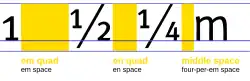 Comparación de los cuadratines en la impresión tipográfica. En amarillo, el nombre de la clasificación de metal fundido y en negro, el nombre del carácter de espacio en blanco al Unicode correspondiente.