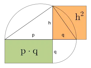 Independientemente de las proporciones del rectángulo dado (aquí, en color verde), se asume que un lado es la sección de la hipotenusa p y el otro lado es la sección de la hipotenusa q de un triángulo rectángulo. Luego, se pivota el lado más corto del ángulo recto y se obtiene la base de un triángulo rectángulo. Sobre esta base se aplica el teorema de Tales. La extensión del lado más corto del triángulo rectángulo interseca la circunferencia de Tales y proporciona la altura del triángulo rectángulo con las secciones de hipotenusa p y q. Si ahora se construye un cuadrado (aquí naranja) por encima de esta altura, entonces tiene exactamente la misma área que el rectángulo dado.