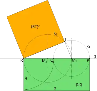 El teorema de la tangente y la secante también se puede usar para cuadrar el rectángulo. Así, en un rectángulo dado (aquí de color verde) con longitud p y ancho q, hacer que la longitud p también se pueda usar como el segmento marcado PR. Ahora, se toma el segmento QR de forma que sea igual al ancho q y quede dentro de PR. Sea ahora M1 el punto medio del segmento PQ. Sea k1 la circunferencia de diámetro PQ y k2 otra circunferencia de diámetro M1R, y sea T una intersección de las dos circunferencias. El ángulo M1TR es recto según el teorema de Tales, y por lo tanto, RT es una tangente a k1. Según el teorema de la secante y de la tangente, entonces (RT)2=pq.