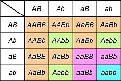 Dicho cuadro puede aplicarse a cruzamientos monohíbrido, dihíbrido y trihíbrido (tres o más pares diferentes de caracteres hereditarios cruzados).[1]