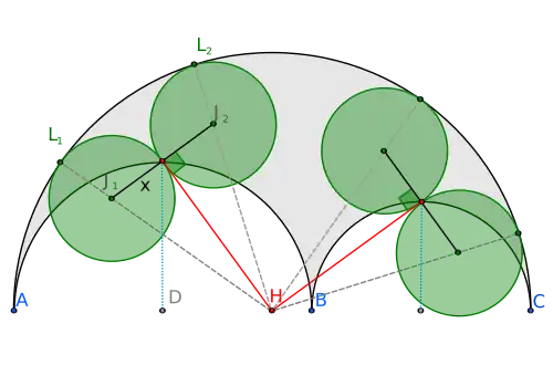 Un arbelos se forma a partir de tres puntos colineales A, B y C y sus tres semicírculos con diámetros AB, AC y BC'. Los dos círculos más pequeños tienen radios r1 y r2, de lo que se deduce que el semicírculo más grande tiene radio r=r1+r2. Sean los puntos D y E el centro y el punto medio del arco, respectivamente, del semicírculo con el radio r1. Sea H sea el punto medio de la línea AC. Entonces, dos de los cuatro círculos del cuádruplete son tangentes a la línea HE en el punto E, y también son tangentes al semicírculo externo. Los otros dos círculos del cuadruplete se forman análogamente a partir del semicírculo con radio r2.